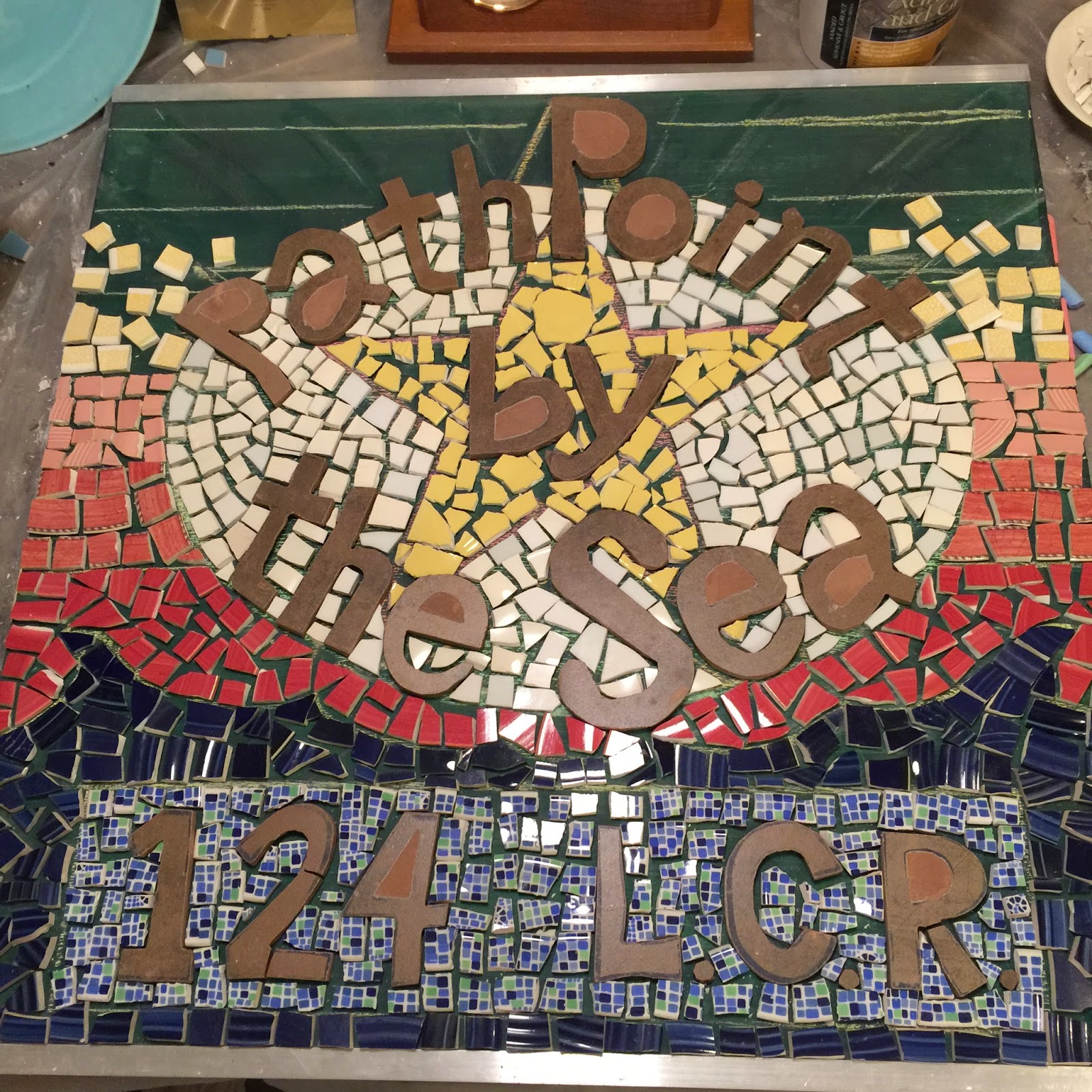 Next came the layout plan. Since my original sketch did not include all of the words that my friends wanted on the sign, I needed to do a lot of tweaking. The color of the water-proofing agent really distracted me and more than once, I thought about painting over it with white paint just to help me with the layout. Everyone always asks how long a mosaic takes to make, and this is the time I always think of when they ask. It involves a lot of moving things around, standing on chairs and squinting. In this case, several four-hour sessions passed before I landed on a layout I deemed suitable. It needed to be friendly, but not juvenile or crafty; and it needed readability without sacrificing beauty. It should feel like a beach-cottage without being cliche'. Finally, it needed some structure, or else it was going to be the worst thing ever... boring.In studying the inspiration signs we first looked at, I noticed a star as a nautical motif that wasn't completely overwhelming and it provided the structure we needed. Drawing a star on that scale really made me wish I had paid more attention in geometry class. I finally abandoned my ruler and compass and went with free-handing and eyeballing. You